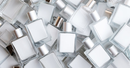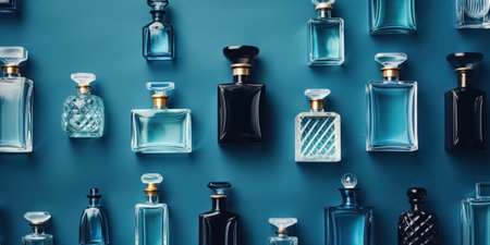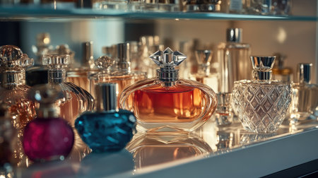 A vibrant display of elegant perfume bottles in various shapes and colors, reflecting light and showcasing beauty and luxury for any aesthetic-focused project.