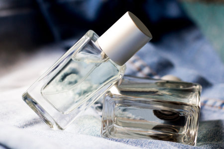 Bottles of aromatic elite perfume on display in beauty store. Delicate miniature perfume bottles on display, glowing softly in the light