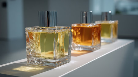 A stunning display of three luxury perfume bottles showcasing exquisite design and color, reflecting elegance in a modern retail environment. Perfect for beauty themes.