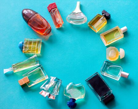 Perfume mockup. Top view set of portable perfume bottle, mini bottles of various shapes. copy space for text.