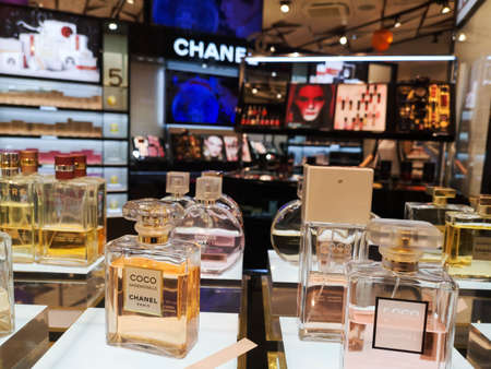 PHUKET, THAILAND - MAY 29, 2022: A rows of Chanel brand perfumes in a case on the supermarket showcase