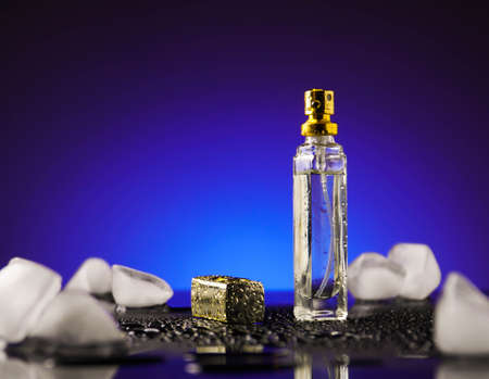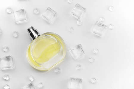 Female perfume yellow bottle, Objective photograph of perfume bottle in ice cubes and water on white table. View from above. Mockup product photo, concept of freshness and aroma
