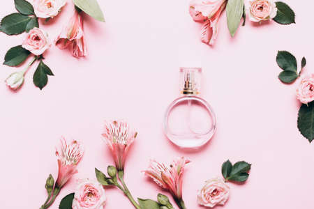Women's perfume bottle and roses flowers on pink background. Creative Layout, copy space.