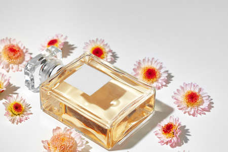 Perfume and flowers on pure white background. Fresh spring flowers and perfume. Fragrance for women. Bridal Perfume, Spring perfumes background with copy space