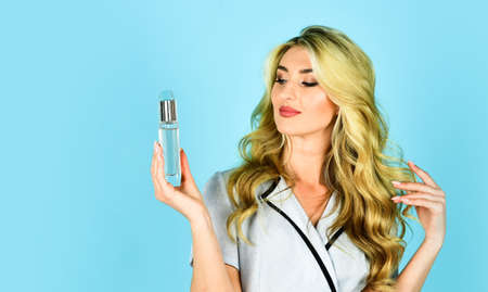 Cosmetics shop. Reveals summer motifs. Girl with perfume blue background. Beautiful woman holding bottle of perfume and smelling aroma. Attractive blonde perfume seller. Gift for her. Pick fragrance