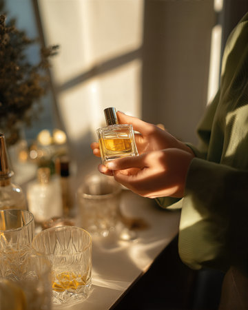 A person holding perfume bottle in warm natural light, close up of hands applying fragrance with focus on bottle and amber liquid