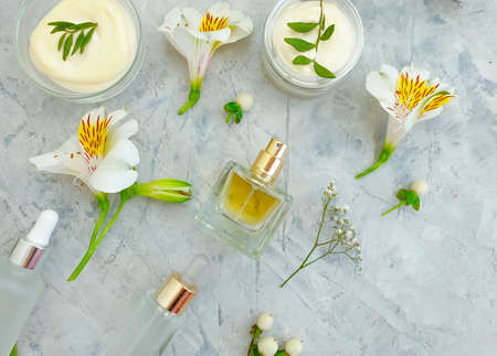 Bottles with women perfume, buds of daffodil flowers and lilac flowers on the white structured background. Women cosmetics. Concept of giving a gift on holidays. Top view.