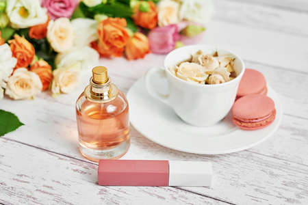 Bouquet of flowers on table. Cup of tea or coffee and macaroons. Greeting card for mothers day. Happy Birthday. Romantic breakfast. Flowers composition for Valentine. Cosmetics perfume and lipstick.