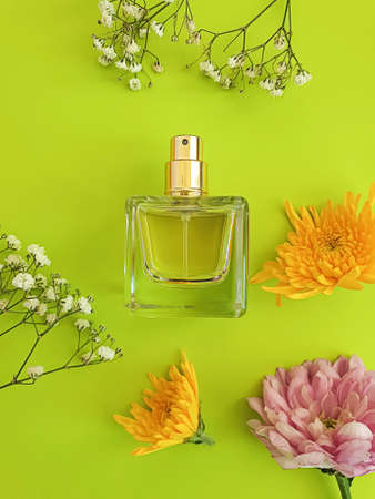 perfume bottle with chamomile scent on yellow background flat lay.