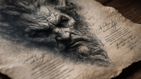Parchment paper rests on a wooden surface, revealing text and shadows that create a historical and cinematic look in the setting