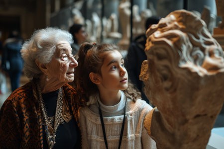 Grandmother and granddaughter looking at sculpture in art museum. Focus on woman