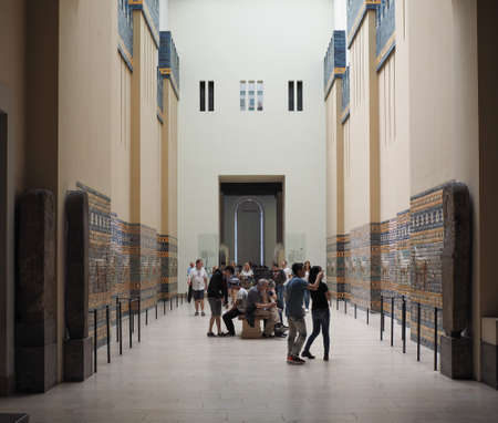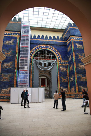 BERLIN, GERMANY - SEPTEMBER 26, 2018: Centralized view of tourists visiting the historical Ishtar Gate of Babylon, made of glazed blue bricks, at the Pergamon Museum, in the Museum Island
