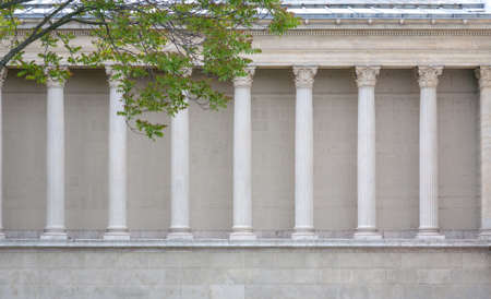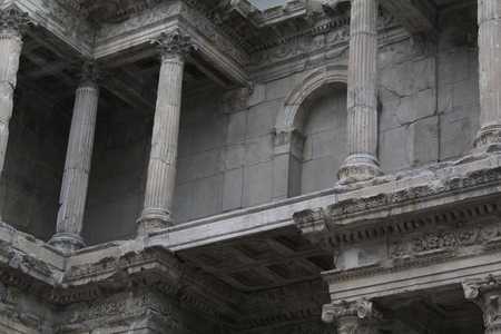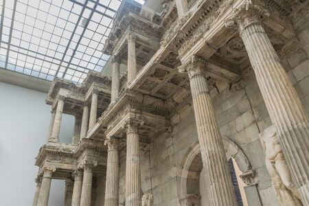 BERLIN, GERMANY - SEPTEMBER 26, 2018: Close up and detailed view of the Architecture of antiquity, the Market gate of Miletus with greek columns contrasting a modern roof at the Pergamon Museum