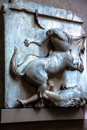 London, UK - October 20, 2022: Centauromachy, battle Centaur and a Lapith. Metopes, detail of Parthenon frieze.