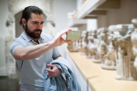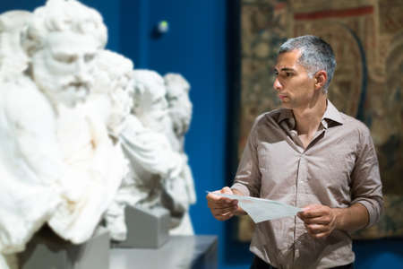 Portrait of contemporary man looking at sculptures and listening to audio guide at museum exhibition