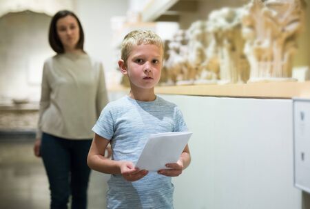 Positive boy observing with interest exhibition in art gallery, young female tutor standing on background