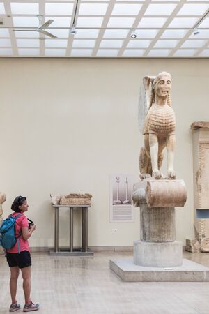 Delphi, Greece - September 21, 2017: The mythical Sphinx of Naxos statue stands on the pedestal in Archaeological museum,Delphi, Greece