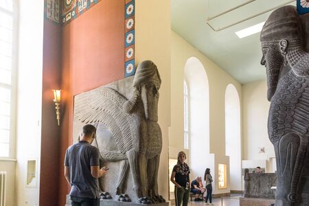 BERLIN, GERMANY - SEPTEMBER 26, 2018: Bright picture of visitors looking at statue exhibitions of Lamassu, an Assyrian protective deity, in the Assyrian chamber, at the Pergamon history museum