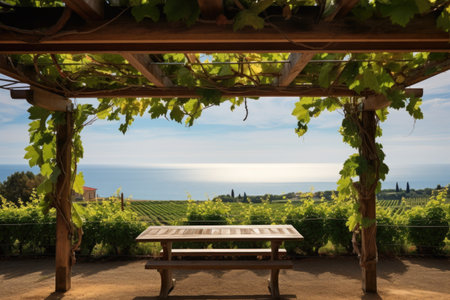 sunlit pergola with grapevines, overlooking the sea, created with generative ai