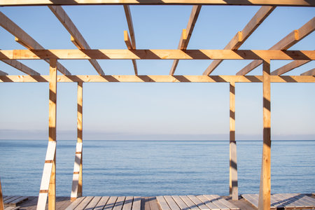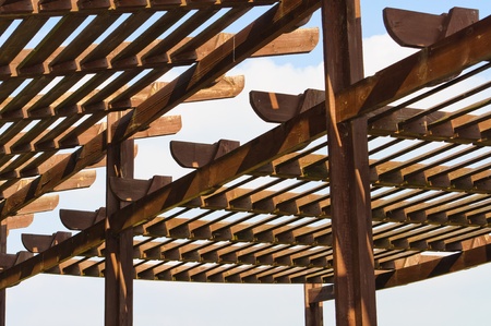 Wooden roof frame and railings on blue sky background