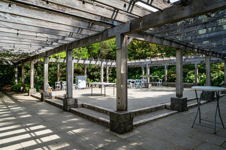 A view of a patio at a building at the Seattle Park Arboretum in Seattle, Washington.