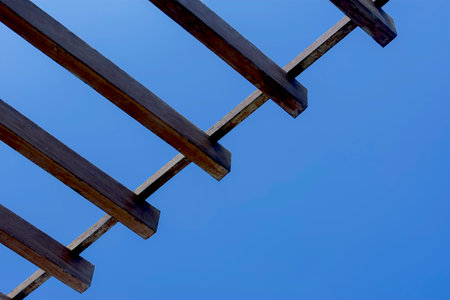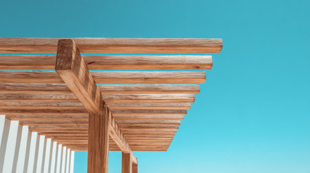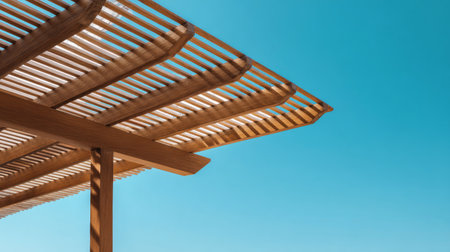 Modern minimalist wooden canopy structure with linear beams, architectural focus on simplicity, open-air design under clear sunny blue sky