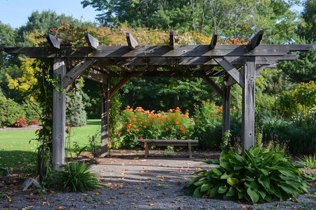 Peaceful garden scene featuring a wooden pergola covered in vines, offering a shady spot to relax and enjoy the surrounding beauty