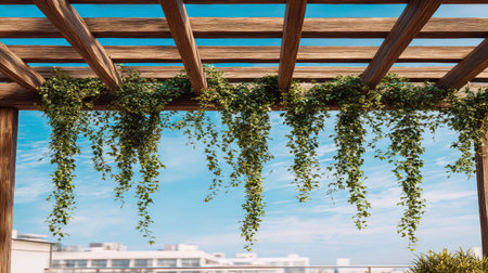 A serene urban rooftop space featuring a wooden pergola adorned with cascading vines against a bright blue sky, enhancing the tranquil atmosphere.