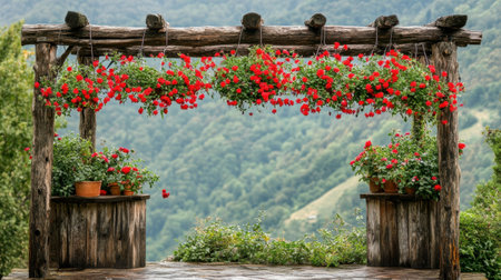A beautiful wooden pergola features cascading red flowers, creating a tranquil and inviting ambiance in a picturesque green landscape, perfect for relaxation.