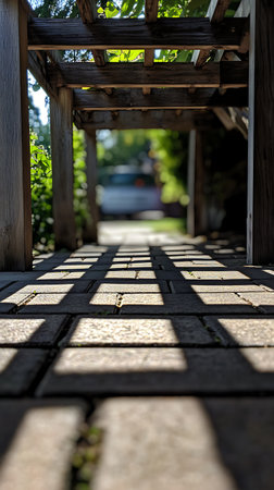 Perspective looking through a wooden pergola at the end of a path, blurred green background. Shadows cast by the pergola create a strong geometric pattern on the stone pavers.