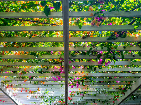 Closeup on a beautiful arbor covered with climbing plants with colorful flowers, relax place, architecture