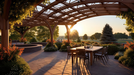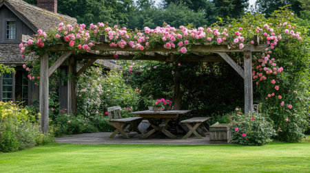 A serene garden scene featuring a charming wooden pergola adorned with colorful flowers, creating a perfect outdoor dining retreat surrounded by lush greenery.