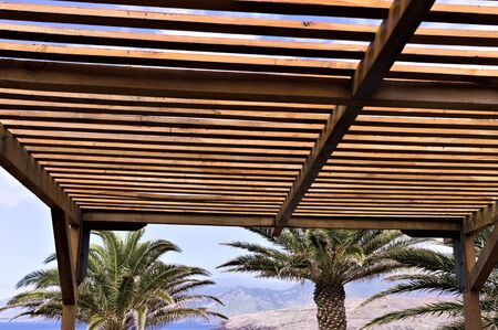 Wooden lattice. The roof of a street cafe made ​​from wooden slats