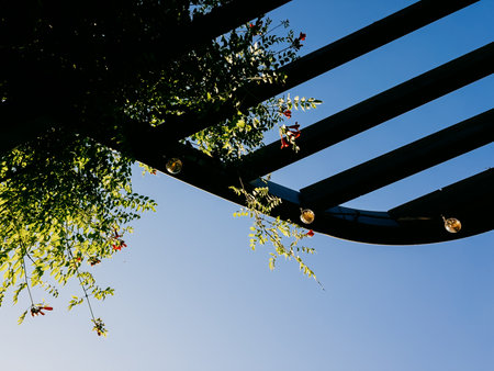 Trumpet vine climbing along pergola, string lights twinkling against clear blue sky, creating serene and inviting outdoor space perfect for relaxation and enjoyment. Vine sprawling over wooden pergola