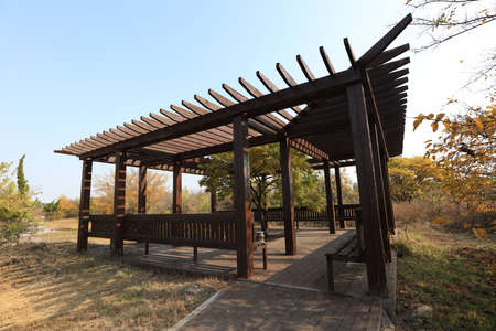 Beautiful wooden pavilions and trees in autumn
