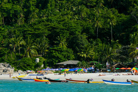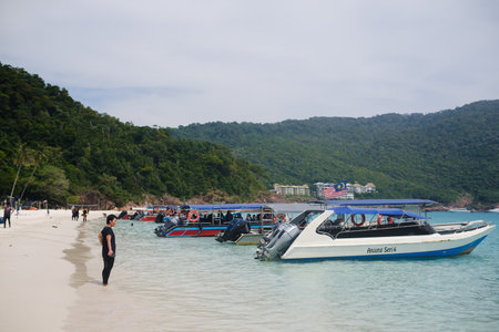 Redang Island. Malaysia. July 26, 2025. Tourist boats are parked at turtle beach. tourists relax on the beautiful white beach