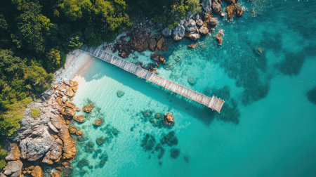 A breathtaking aerial view showcasing a vibrant tropical beach with a wooden pier extending over clear turquoise water, surrounded by rocks and greenery.