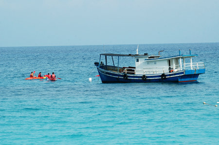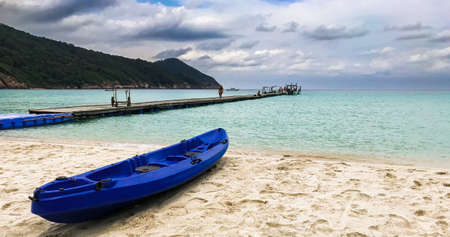 Redang Island, Malaysia Colourful blue kayak boat on the beach ready to be sailed early in the morning