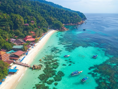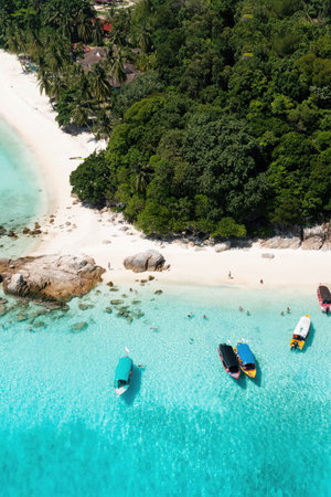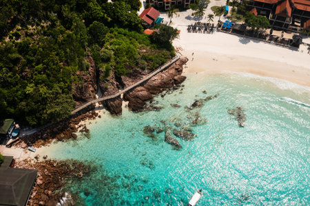 Aerial view of a tropical beach with white sand and coral reef on the island of Lang Tengah, Terengganu, Malaysia.