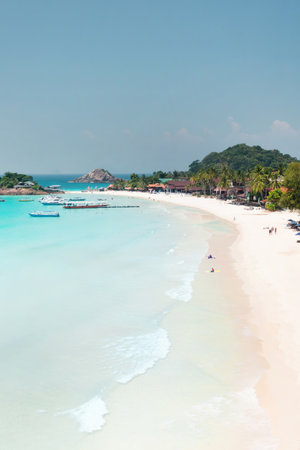 Top view of Long beach with clear turquoise waters and tourists on Redang Island. Malaysia.