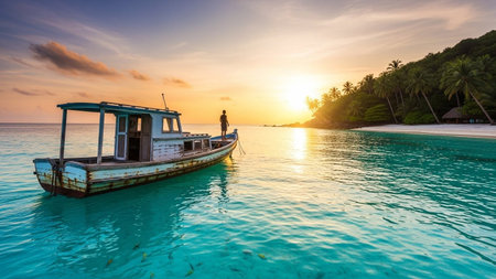 Trees showing a weathered wooden boat floats on turquoise water near a tropical island beach at sunset with palm...