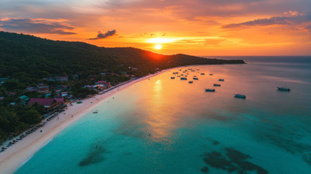 Aerial view of beautiful tropical beach with turquoise water and coconut palm tree at sunset time.ai generated