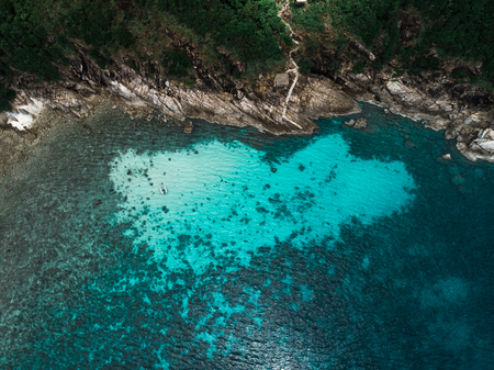 A breathtaking aerial view of a secluded Surin islands with crystal-clear turquoise waters, surrounded by lush green vegetation and corel reef. The pristine white sand and vibrant ocean hues