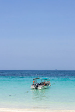 Boat at crystal clear waters Perhentian Kecil Island beach, Terengganu, Malaysia.