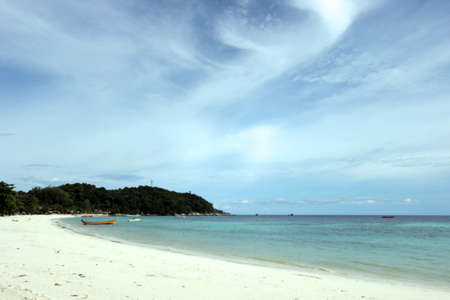 Boats, turquoise water and white sand beach, Redang Island, Malaysia