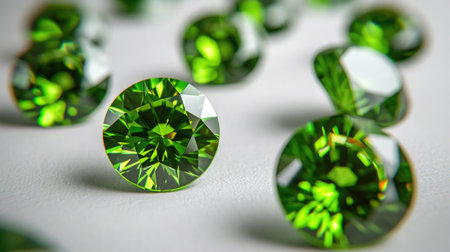 Beautifully cut green gemstones resting on textured surface in soft natural light