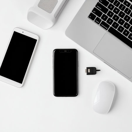 Arrangements of a smartphone, tablet, laptop, mouse, and other accessories showcase a modern workspace setup. Perfect for tech enthusiasts.