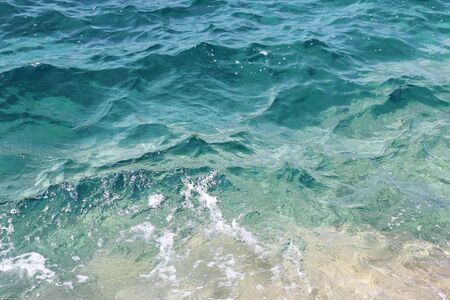 Sea surface aerial view. Background image of the turquoise sea. Deep sea and corals. Aerial drone shot of turquoise water, space for text. Aquamarine background. Sea Aerial view.