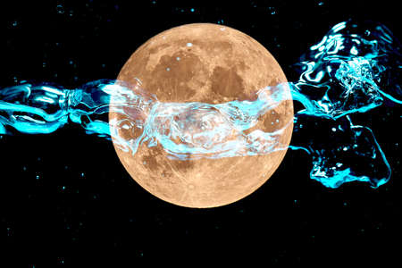 Man holding yellow moon shape illuminated sphere. Surrealistic photo style, contemporary art element for design, posters and banners. Neon blue light.