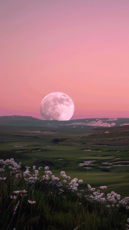 Majestic full moon rising over a serene golf course at dusk, surrounded by lush green grass and wildflowers The sky transitions to soft pink hues
